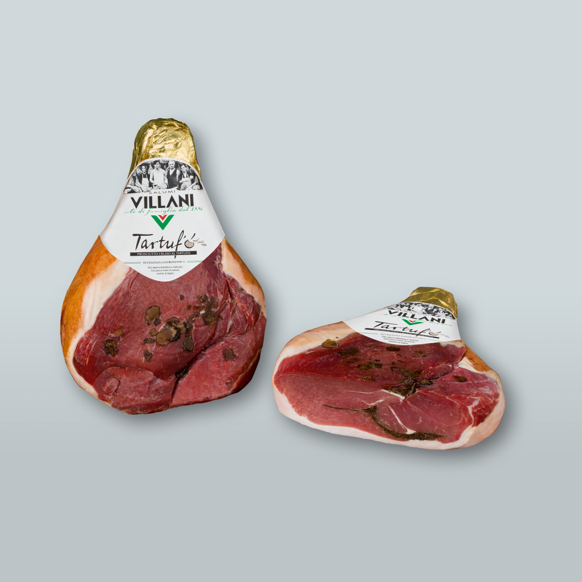 Jambon cru à la truffe Villani Après séchage, désossage très minutieux et nettoyage approfondi en éliminant le gras, les éventuelles parties foncées du muscle et la graisse jaune. Puis ajout d’une farce à base de truffes d’été avant mise en moule. La saveur délicate mais caractéristique de la truffe, l’ajout de morceaux entiers de truffe bien visibles à la découpe permet d’avoir un jambon aussi esthétique que gustatif.